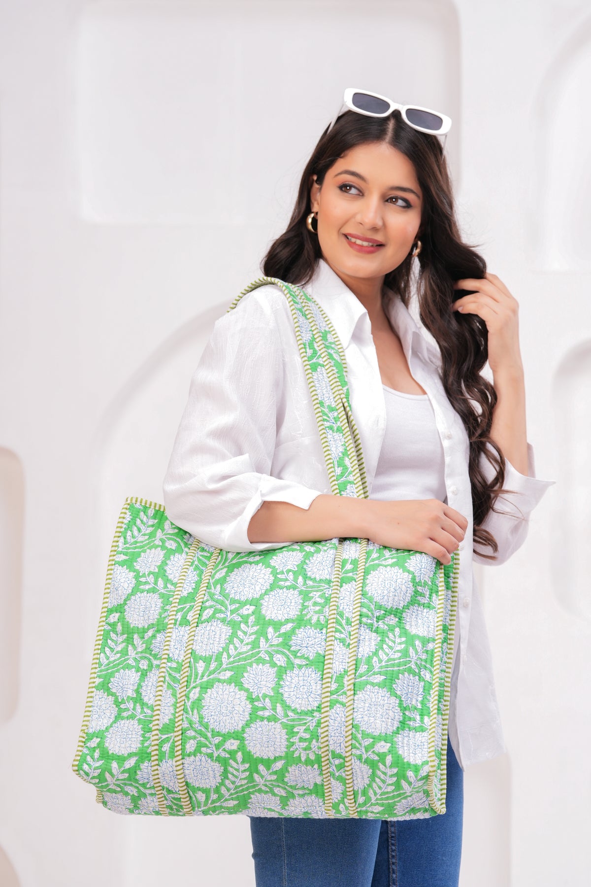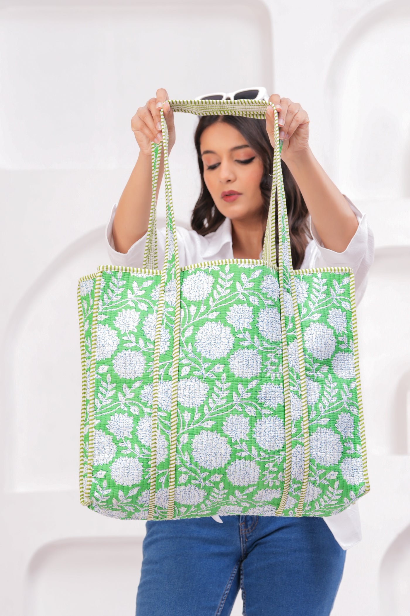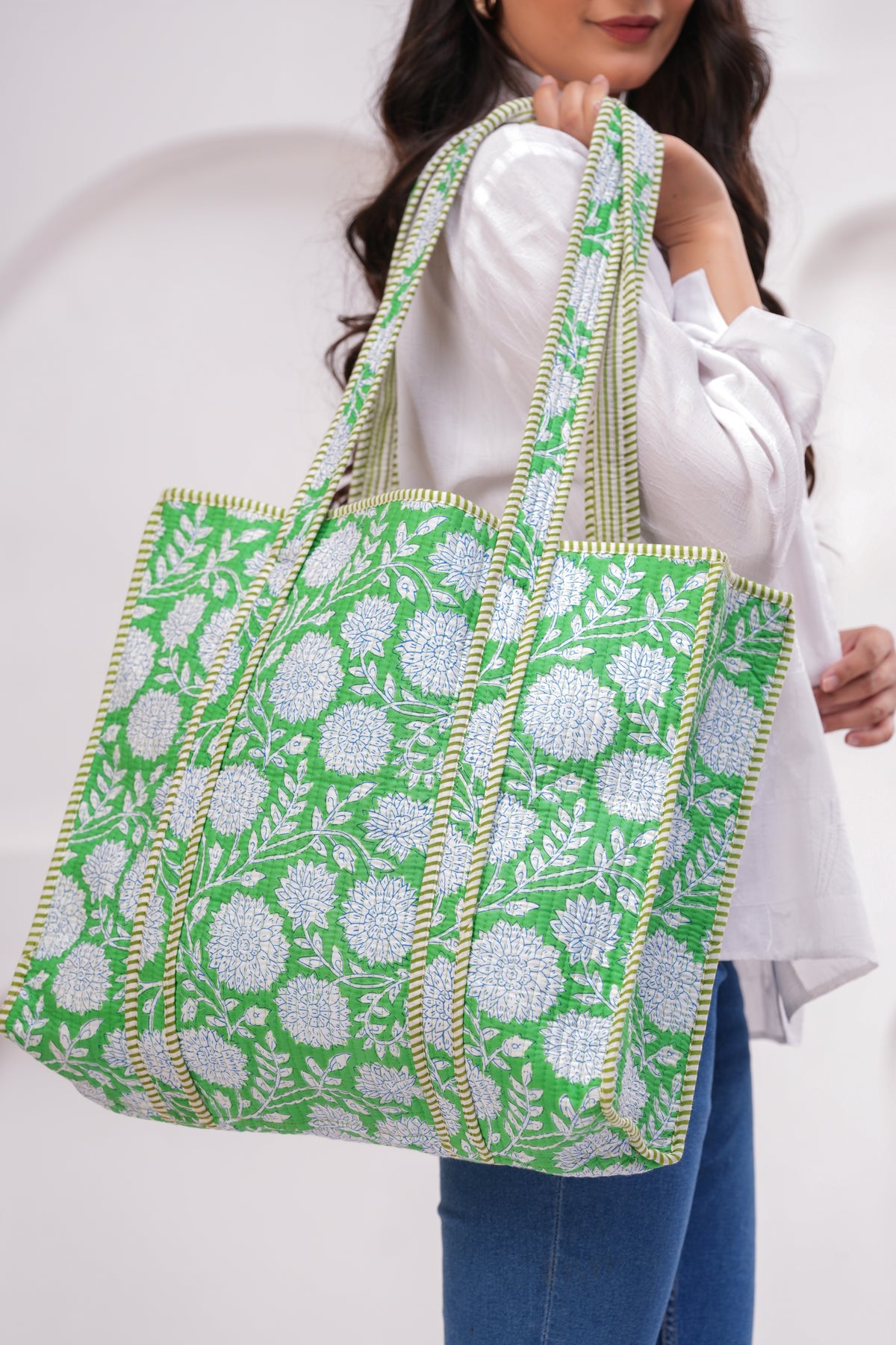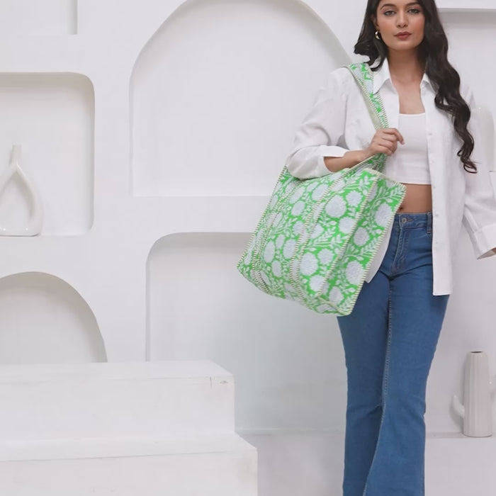 Green & White Quilted Cotton Tote Bag | Handmade Floral Print Shoulder Bag | Eco-Friendly Round Handle Purse for Daily Use